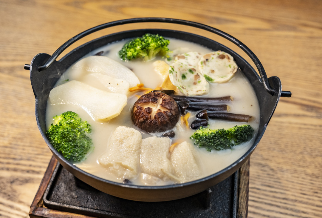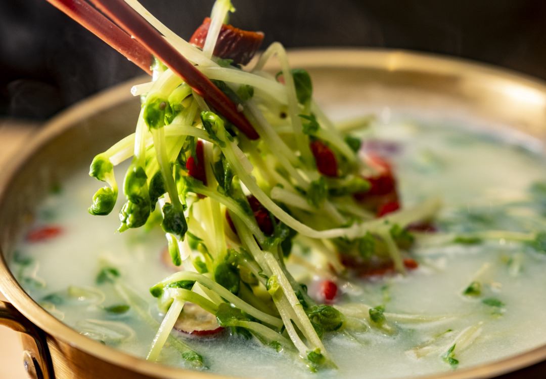 广州春季往往十分潮湿,具有祛湿作用的天麻也比较适合在春季食用。有别于市面上常见的干天麻,店里的天麻竹笙锅使用的是新鲜天麻,新鲜天麻有点像山药,但口感更脆,更加爽口。锅底是用胡萝卜、莲藕等蔬菜熬煮的高汤,里面添加了植物蛋奶,因此颜色是浓白色,整体偏清爽。