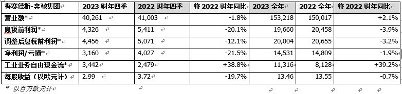 梅赛德斯-奔驰集团股份公司(股票代码:MBG)在2023年实现了稳健的财年表现。通过聚焦令人向往的乘用车和轻型商务车产品以及持续的成本控制策略,其全年实现了197亿欧元的集团息税前利润(2022财年:205亿欧元)和1,532亿欧元的集团营业额(2022财年:1,500亿欧元)。受到供应链制约和宏观经济波动等影响,市场环境充满了挑战,梅赛德斯-奔驰乘用车业务的调整后销售利润率(RoS)为12.6%,梅赛德斯-奔驰轻型商务车业务调整后销售利润率达到15.1%,梅赛德斯-奔驰出行业务调整后资产收益率(RoE)为12.3%。
