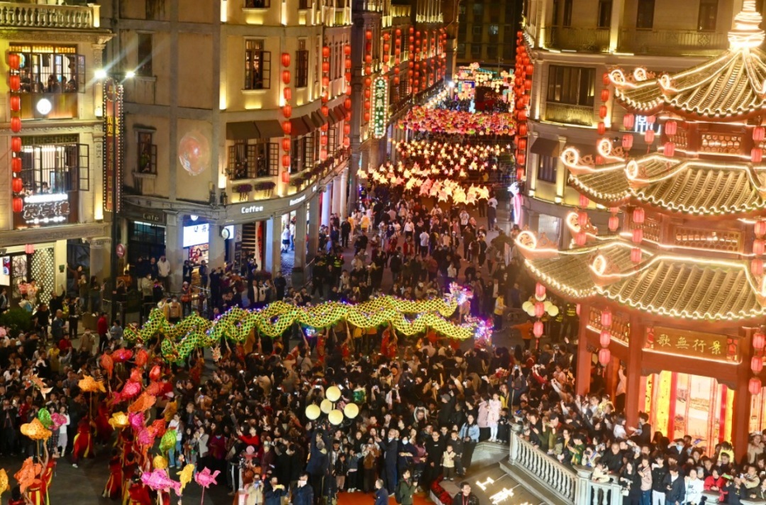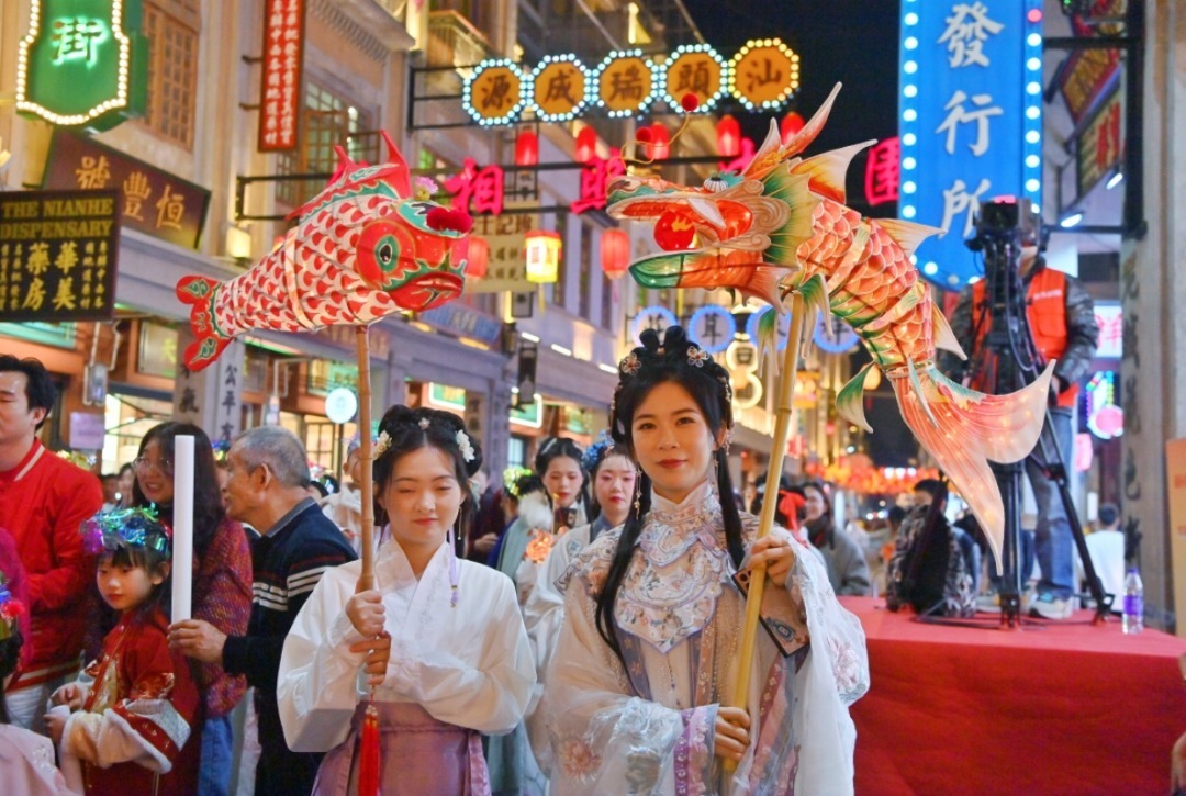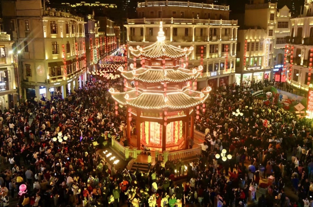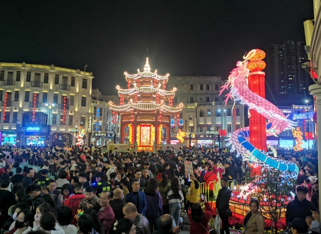 万灯璀璨闹元宵,良辰美景共团圆。元宵节晚上,走进汕头市小公园开埠区,犹如置身于奇幻浪漫的灯火世界。当晚的小公园开埠区人声鼎沸,人们赏花灯、看民俗、品美食,在璀璨灯海中饱尝一场潮侨文化与异国风情相融、传统民俗与现代科技交汇的节日文化盛宴。