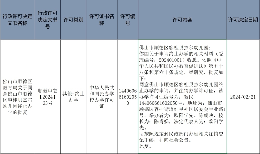近日,佛山市顺德区人民政府官网公示:容桂贝杰尔幼儿园的终止办学的申请已正式获批。
