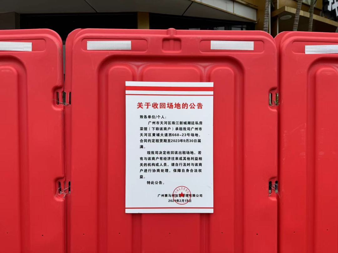 2月27日,记者走访跑马场发现,位于马场西路的餐饮店不少已经闭店停止营业,餐厅门外有广州赛马场运营管理有限公司贴出的《关于收回场地的公告》。公告显示,多家餐饮商户承租广州赛马场运营管理有限公司位于广州市天河区黄埔大道西668号广州马场内的场地,合同约定租赁期至2023年9月30日届满。现广州赛马场运营管理有限公司决定收回出租场地,若有与该商户有经济往来或其他利益相关的机构或人员,请自行及时与该商户进行协商处理,保障自身合法权益。