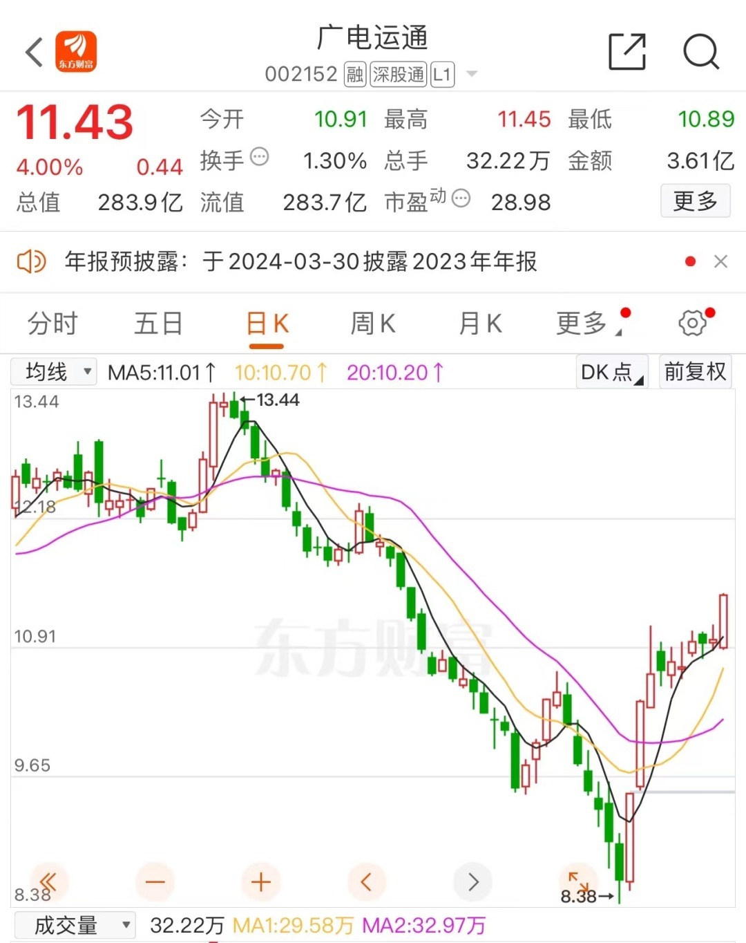 2月27日晚间,广电运通发布2023年度业绩快报显示,公司2023年营业总收入、归母净利润、扣非归母净利润等指标均创历史新高。截至当日收盘,广电运通报收11.43元/股,大涨4%。