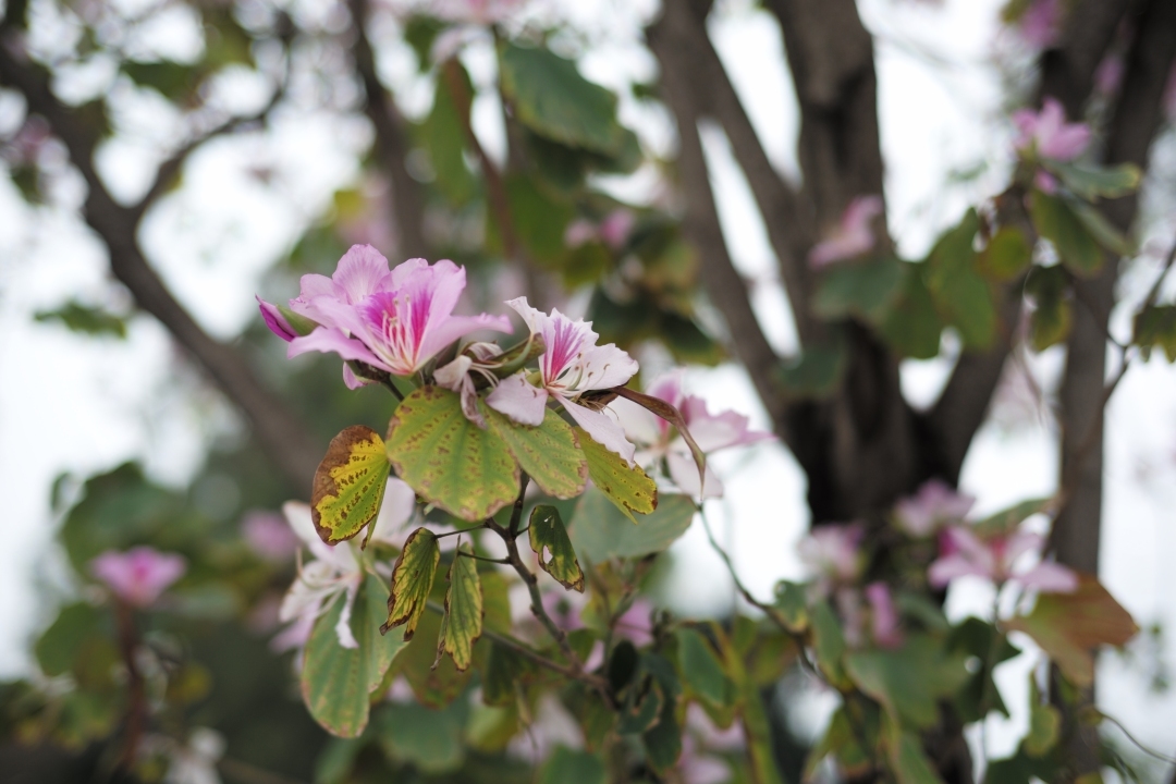 华南快速干线花城大道出口则有宫粉紫荆101株,花期在开春3月份前后。开花时总状花序侧生或顶生,呈伞房花序式,花朵多,花色为紫红色或者淡红色,白色,花瓣倒卵形或倒披针形,有一定的观赏价值。它喜温暖环境,适合在我国南方地区栽培,耐寒性有限,北方地区气候寒冷,花期会大大缩短。