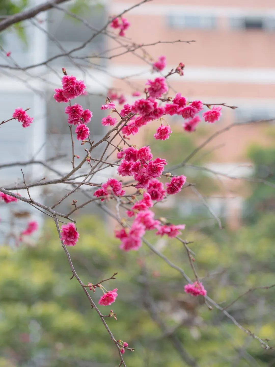 华农校园内的樱花品种多样,包括有寒绯樱、中国红、广州樱、八重樱等,盛开的樱花千姿百态,浓郁的红色点缀了亭台楼阁,无论是低头还是向前伸展,或是含苞待放的花蕾,都为校园增添了春色。除了粉嫩的樱花,紫荆花、黄花风铃木也相继开放。