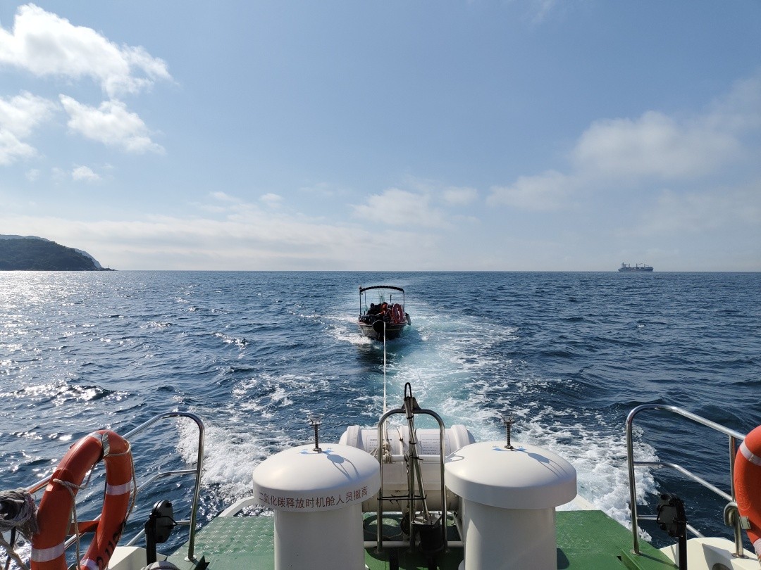 当日9时许,深圳海警局某摩托艇在大鹏湾附近海域巡逻过程中,发现一艘失去动力的快艇在海上漂流,1名船长和2名游客被困,存在无序漂流、碰撞礁石的危险,执法艇迅速上前了解情况。