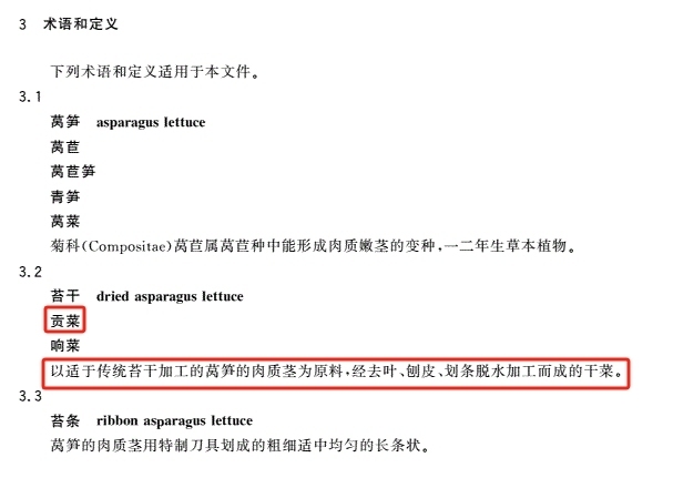为此,有约君查阅了现行国家标准《GB/T 29564-2013 苔干》的定义:苔干是用适合做苔干的莴笋的肉质茎为原料,经去叶、刨皮、划条、脱水加工而成的干菜。这里的苔干就是贡菜,并没有对产地有严格要求。