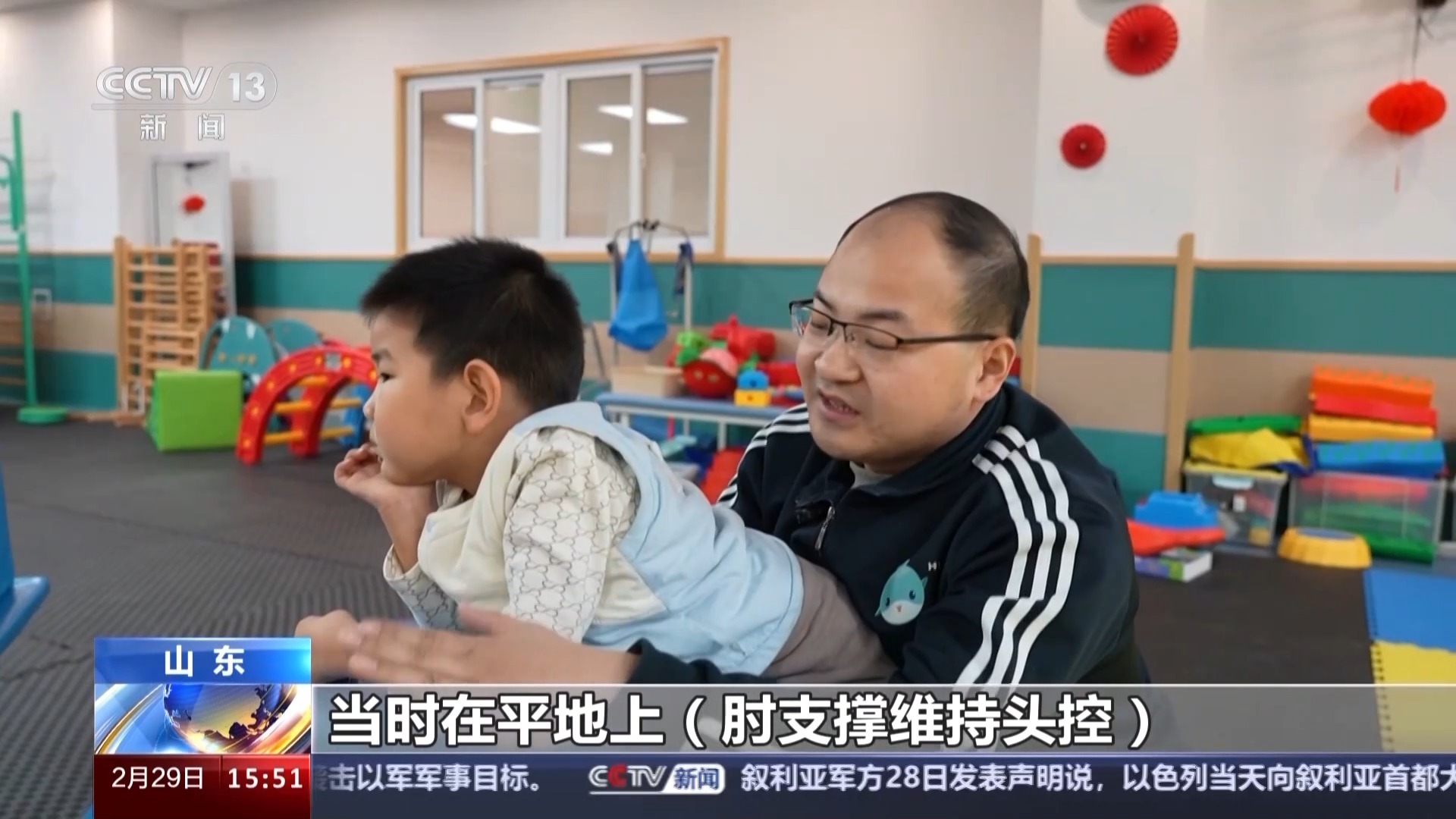青岛某康复中心肢体负责人 徐丹:之前在平地上肘支撑维持头控,他只能维持5秒钟。现在,他可以在这个肘支撑上,可以进行向前移动,而且在球上也可以实现从肘支撑到手支撑的过渡。