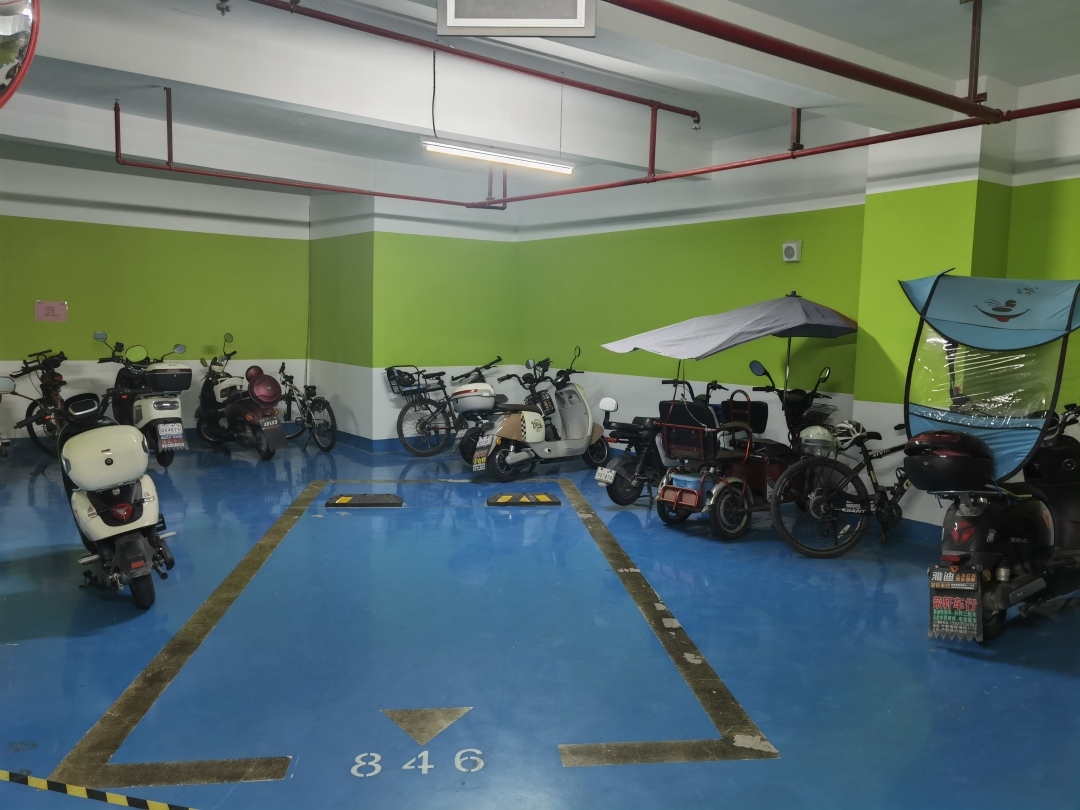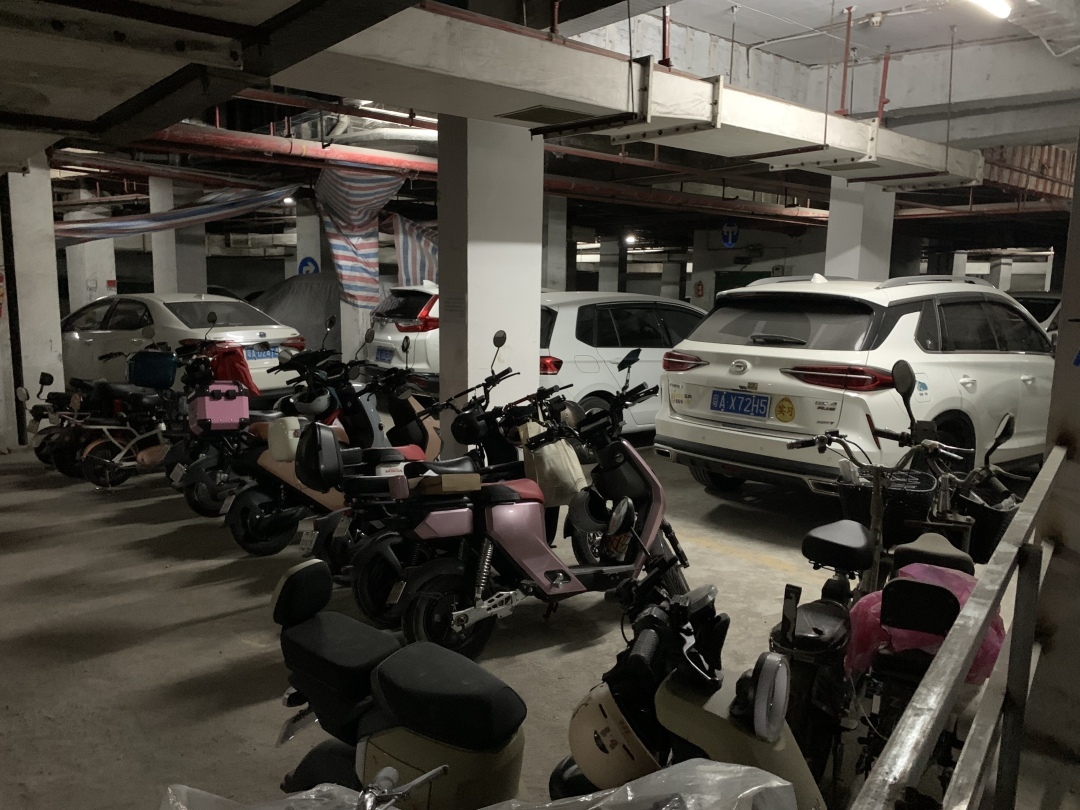 (海珠区怡龙苑地下停车场,电动自行车就停在机动车旁边)