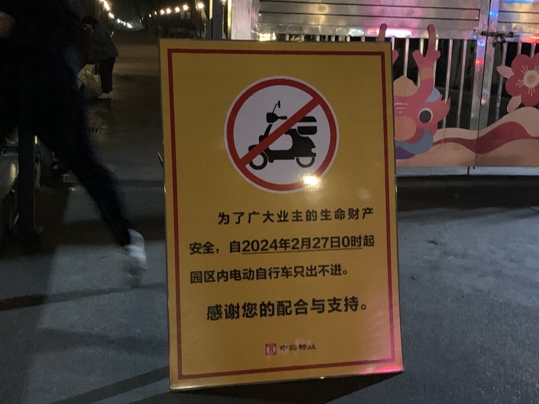2月27日零时起,海珠区光大花园在各大出入口贴出了告示,告知住户电动自行车“只出不进”,有住户想将电动自行车骑入小区,都被门口保安拦阻。有住户表示“通知来得太突然”“不知道该把车停到哪里”,有住户在门口质问保安,但也无法取得同意进入小区。