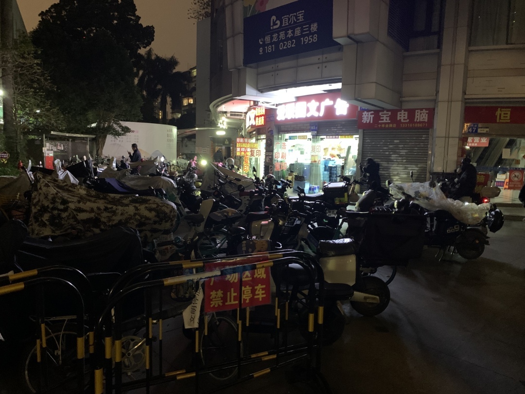 (宝岗大道恒龙苑禁入电动自行车,楼外的空地,停满电动自行车,一旁就是临街商铺。)