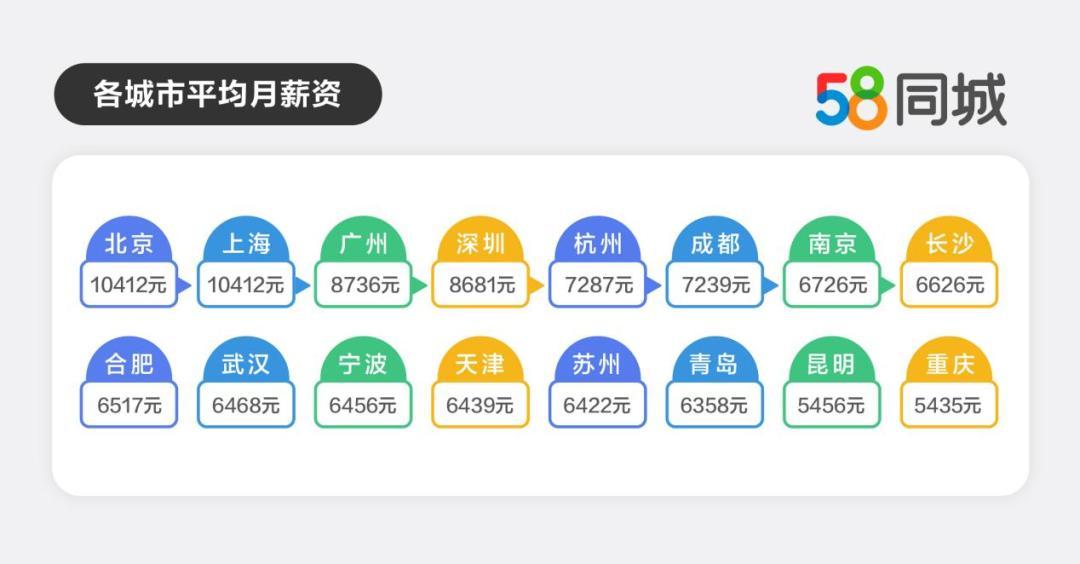 通过对各城市平均工资进行调研发现,北京、上海、广州、深圳四个一线城市的平均月薪酬仍“一骑绝尘”,平均月薪资水平分别为10412元、10412元、8736元、8681元。新一线城市中,成都、杭州的工资水平也相对较高,两地集聚着大量智能制造业、互联网领域“大厂”,经济快速发展,加上政策红利的不断释放,许多行业的薪资也相应提高,拉动整体薪资水平上涨,平均月薪资均超过7000元。