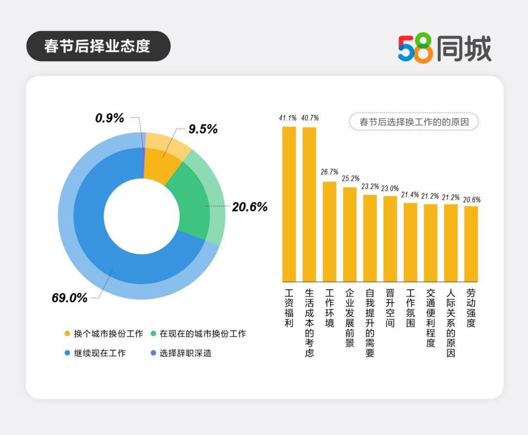 从2024年就业市场走势看,消费回暖的同时,就业压力仍存,令不少年轻人下决心“深耕”现在的岗位。报告显示,有69%的职场人在春节后将继续从事目前的工作,选择继续在当前城市工作主要出于人际关系的考虑,其次是就业岗位选择多。