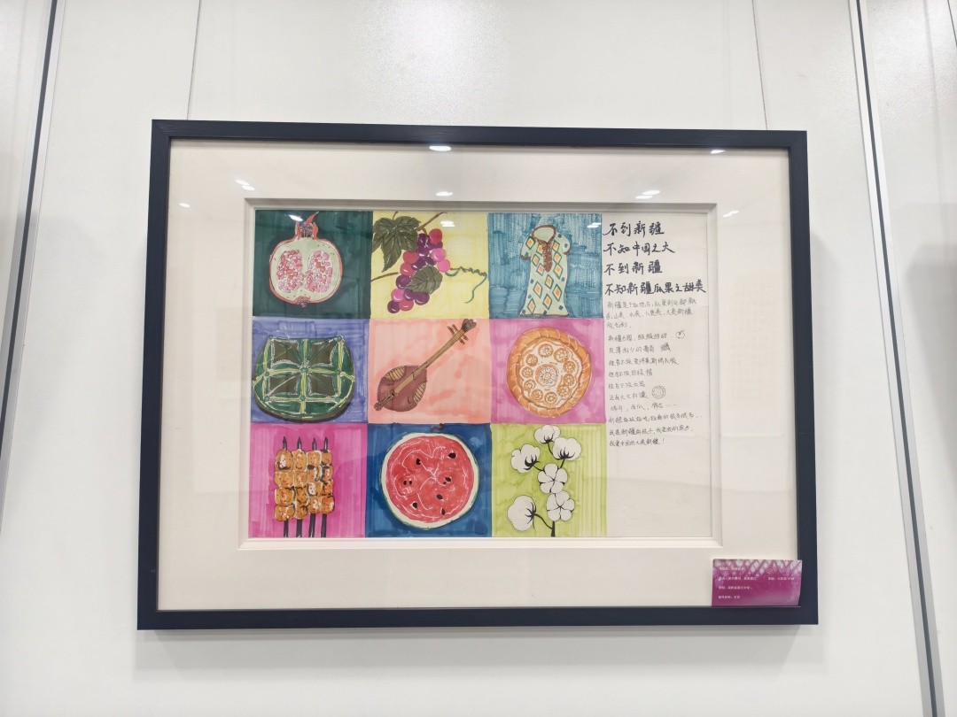 “参观完这个优秀作品展,我们从邱老师的讲述中了解了新疆的特色文化。邱老师将蓝染艺术带到了新疆的学校,教新疆的学生们用自己的双手创造出了一件件漂亮又独具特色的蓝染作品。蓝染最早出现于秦汉时期,它是我国的一种古老印染工艺,是我国珍贵的非遗文化。蓝染的技艺传承应该得到重视。”广州艺中高二(6)班学生李绮萍参观完书画展后颇有感触,她说,非遗文化传承的工作落在了新时代的年轻人身上,“文化传承的道路任重而道远,我们要在创新中传承中华优秀文化,让它在世界上发扬光大。”