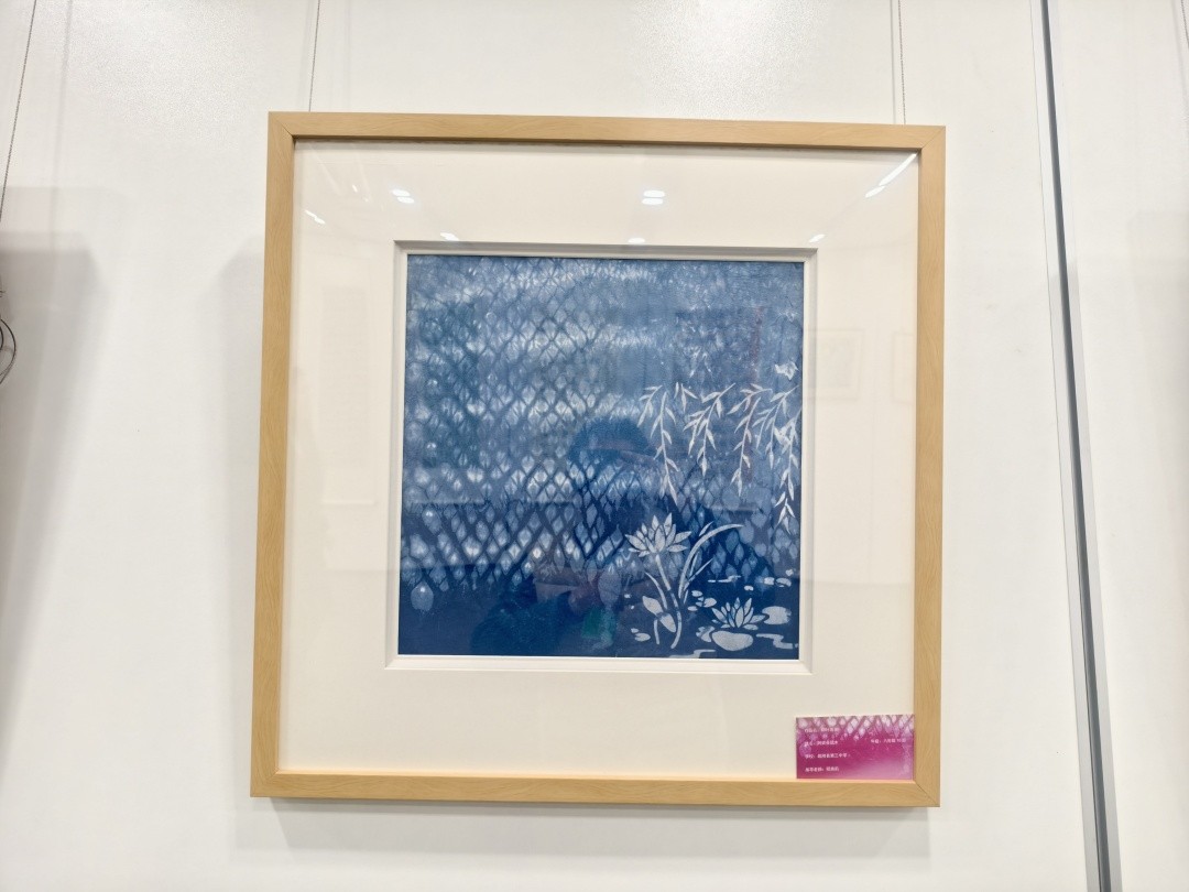 邱燕莉指着其中一幅作品介绍说,这是通过蓝染技术做的扎染。新疆本地也有自己的扎染技术——艾德莱斯。新疆的女孩子们都很擅长编辫子,因此在学习蓝染技术时得心应手,她们手里出来的蓝染作品都很扎实,再加上一些创新的技法,一个彰显新疆地区特色的蓝染作品就展现在了眼前。