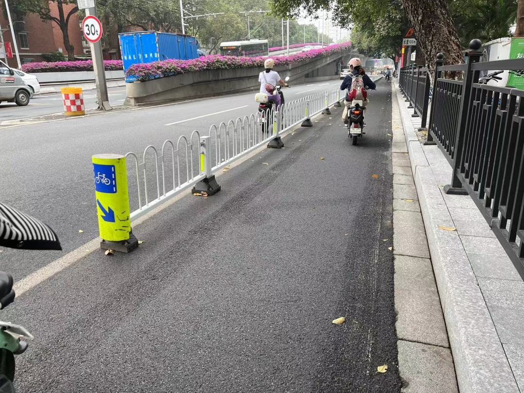 近年来,类似的交通事故已发生多宗,内轮差视野盲区不容忽视。为减少“内轮差”导致的交通事故,广州交警对大型车辆通行量较多的路口设置了右转危险警示区。该警示区是由大型车辆前后轮转向轨迹围成的区域,使用彩色涂料铺装,增加“危险区域”文字,以警示非机动车和行人禁止进入。