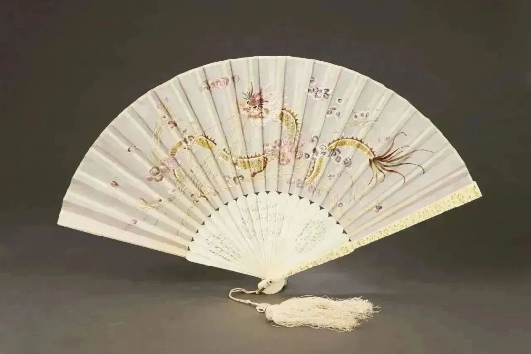 这把十九世纪末的象牙透雕双面广绣龙纹折扇,扇面整体配色高贵典雅,运用广绣传统技艺绣上飘逸动感的龙纹、祥云等中国传统的吉祥纹饰,表达了对吉祥、幸福、美好生活的希冀。