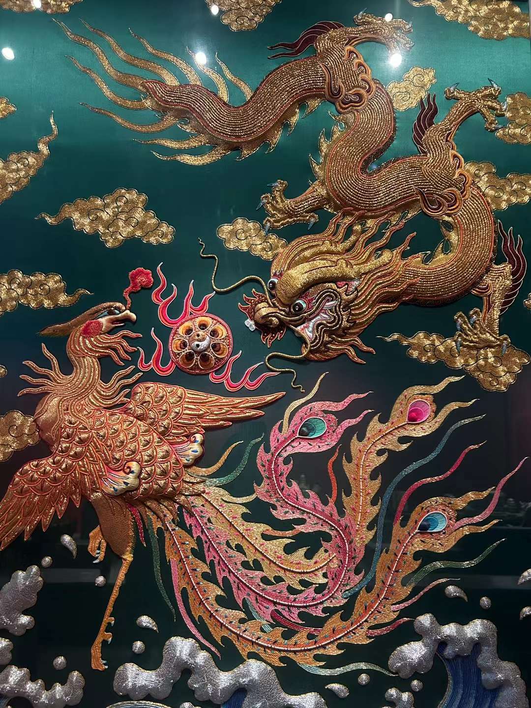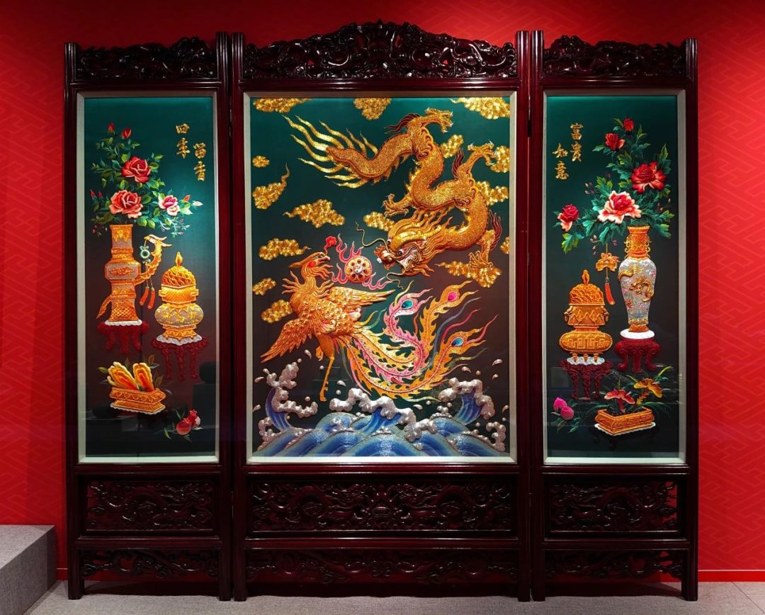 这件潮绣屏风是中国工艺美术大师林智成创作,长210cm,高198cm。主屏刺绣一对龙凤在云海间遨游飞翔,祥云朵朵,海水澎湃。在金银线的衬托下,龙凤更加栩栩如生。左右两屏则以细腻的线条勾勒花瓶、花卉、宝鼎、佛手、石榴、灵芝、寿桃等博古图案,寓意祥瑞、平安和幸福。