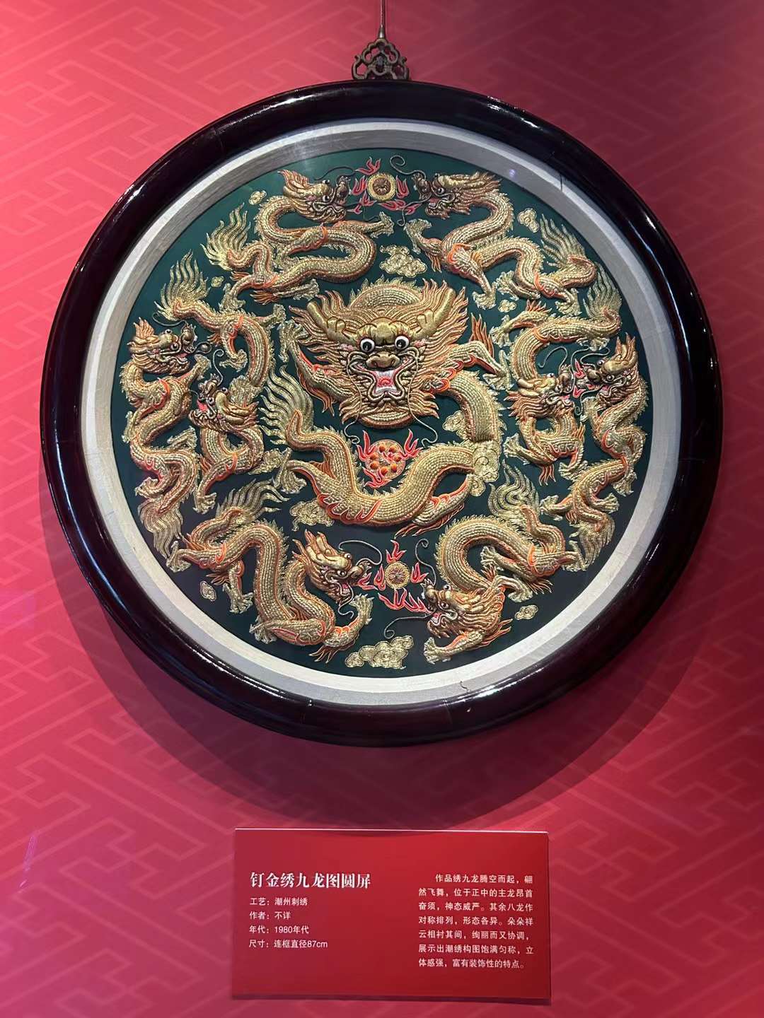 此件潮绣直径87cm,制作于上世纪80年代。作品绣九龙腾空而起,翩然飞舞,位于正中的主龙昂首奋须,神态威严。其余八龙作对称排列,形态各异。朵朵祥云相衬其间,绚丽而又协调,展示出潮绣构图饱满匀称,立体感强,富有装饰性的特点。