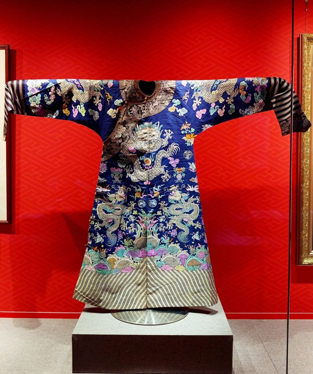 此清代广州织锦男服长83cm。作品质地紧密,纹理清晰。织锦上精细的五爪龙纹图案,象征着权力和尊严,也展现了人们对龙的崇敬和敬畏。整件长衣色彩层次丰富,视觉效果极佳,彰显了织绣艺术的卓越成就。