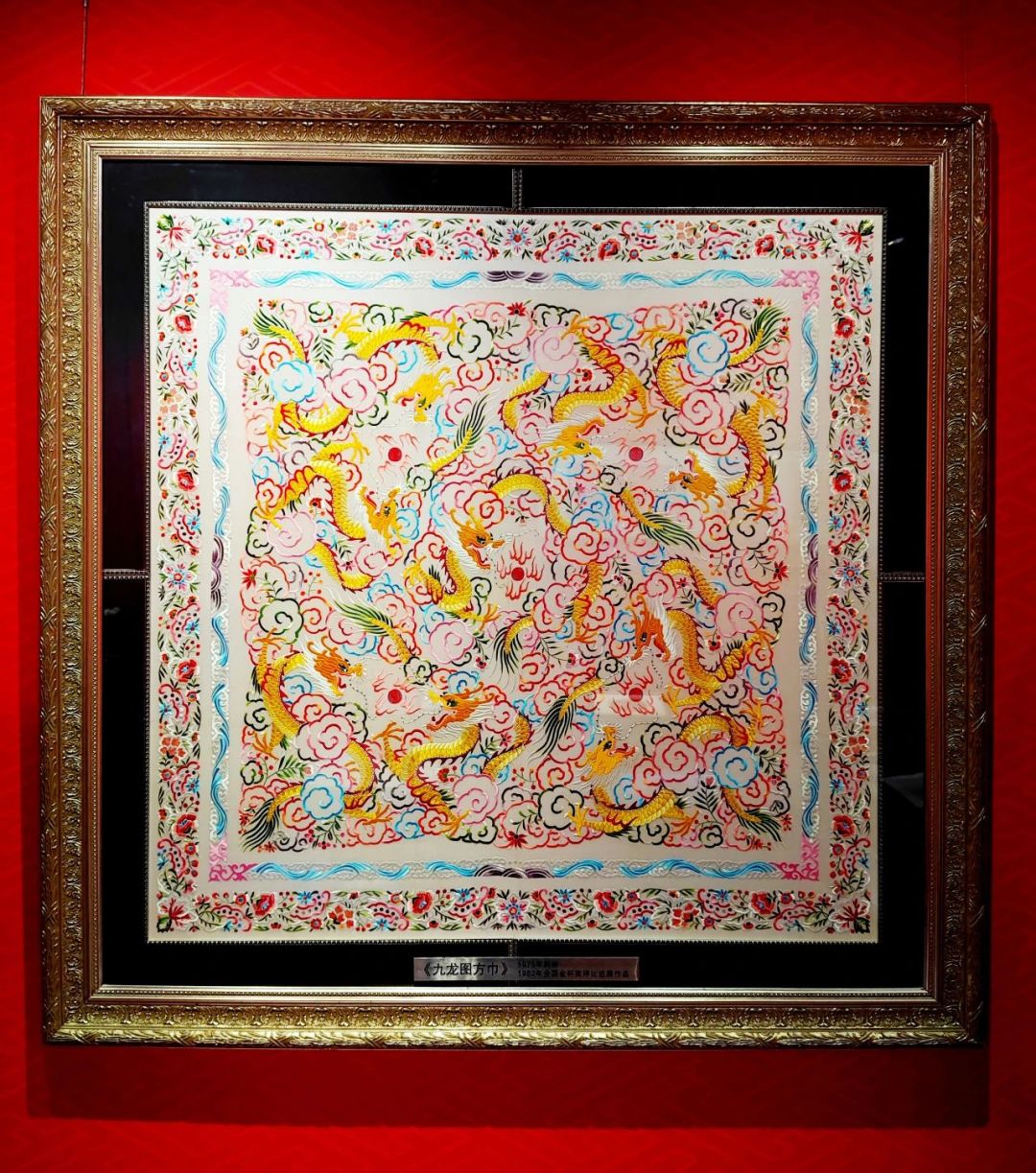 方巾以白色为底,采用红、黄、绿、蓝等多种色彩,灵活运用直针、扭针、捆针、铺针等多种针法勾勒出九条形态各异的龙,色彩对比鲜明,层次丰富。龙的姿态与构图相互呼应,形成一种动态的平衡,严谨而不失生动,突出了画面的立体感和质感。