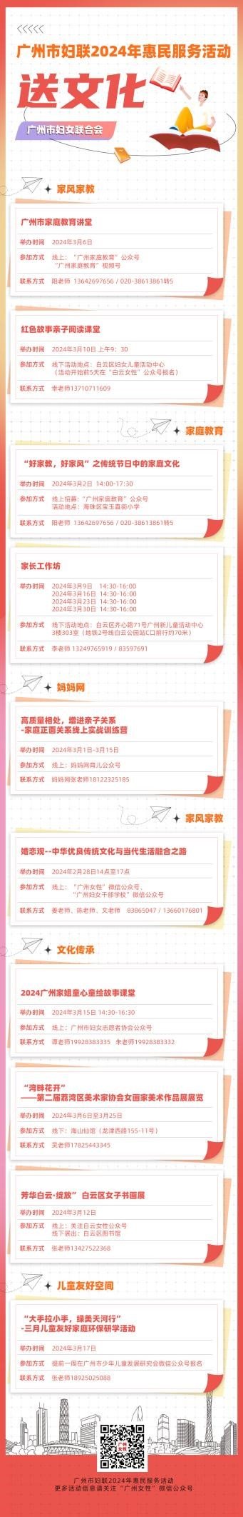 广州市家庭教育讲堂、新时代文明实践之家长学校、家长工作坊……广州市妇联“巾帼送暖 福满羊城”广州市妇联2024年惠民“六送”服务活动“送文化”版块,秉承传承弘扬好家教好家风,推动形成社会主义家庭文明新风尚的理念,聚焦学习建设好家庭、传承好家教、弘扬好家风的经验和做法,为广大亲子家庭送上了一份形式丰富的亲子活动大礼包!