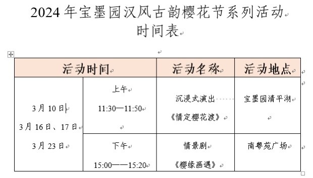 3月10日、3月16-17日、3月23日,宝墨园、南粤苑都将举办一系列精彩缤纷的沉浸式表演,更有樱花主题打卡场景,完美融入到灿烂樱花、园林古建的天然实景当中,为爱花惜花赏花之人塑造了古典浪漫的摄影场景,让游客们在汉风古韵的樱花美景中流连忘返。