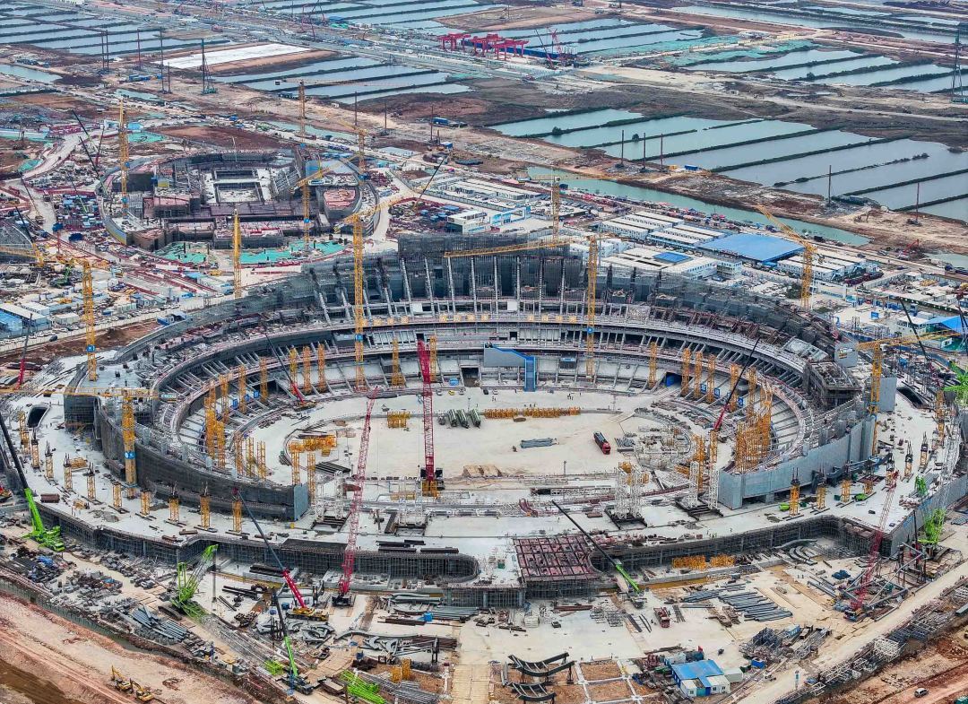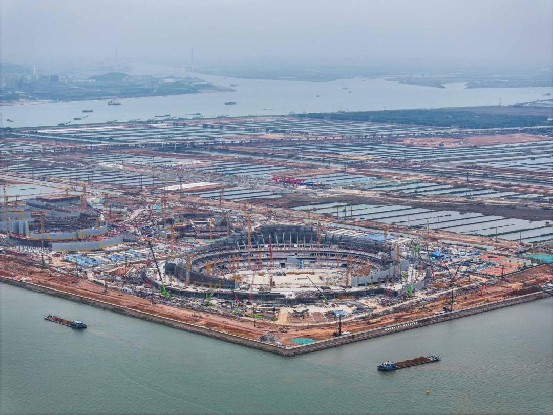 新春伊始,伶仃洋畔的南沙全民文化体育综合体现场,1000余名建设者正在紧锣密鼓地推进施工,汽车吊车、履带吊车机械轰鸣,施工车辆不停穿梭,一片火热的建设场面。截至目前,6万座的综合体育场已浇筑完成14万m³混凝土,完成主体结构进度的99%。