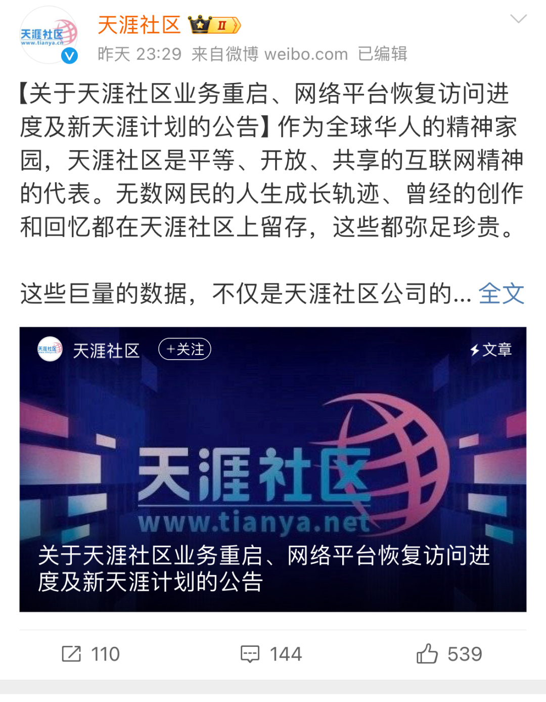 3月1日晚间,天涯社区在其官方微博发布《关于天涯社区业务重启、网络平台恢复访问进度及新天涯计划的公告》(简称:公告)称,“我们将采取引入战略投资、恢复广告业务、启动社交电商平台及大力开展会员增值服务等方式筹措资金,在确保数据安全合规的前提下,在2个月内,即5月1日前恢复天涯社区访问。”