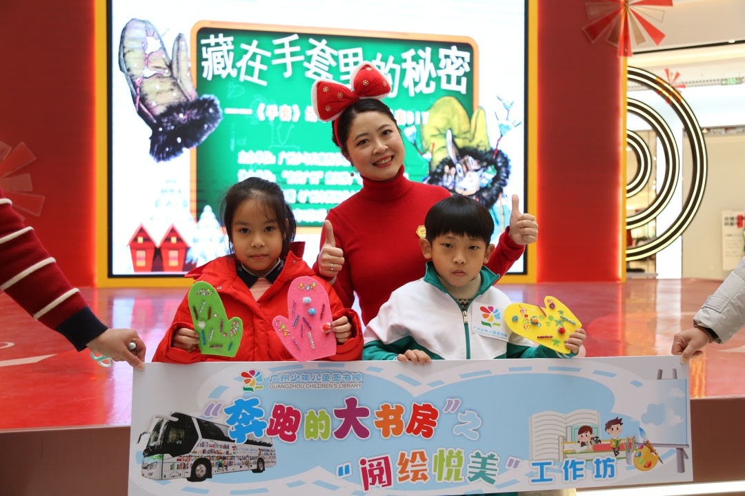 书车外,广州少年儿童图书馆吉祥物小悦悦也吸引着孩子们的眼球,纷纷前来合影留念。在书车一侧,家长们认真观展,《亲子悦读——从授人以愉到授人以渔》主题展览向家长们介绍如何开展亲子阅读、泛在阅读,让家长大受裨益。在书车另一侧,手工故事会、手工DIY、故事衣制作等活动正热火朝天轮番上演,在图书馆员的指导下,大小读者们动起小手一起制作与绘本故事相关的手指偶、故事衣,成为故事的主人翁。“妙指生花”故事创艺坊中,在工作人员的精心指导下,一张张平平无奇的不织布,在孩子们精巧的小手下,从图画书中走出来,化作一朵朵栩栩如生的木棉花、憨态可掬的萌宠龙、五彩斑斓的鹦鹉……