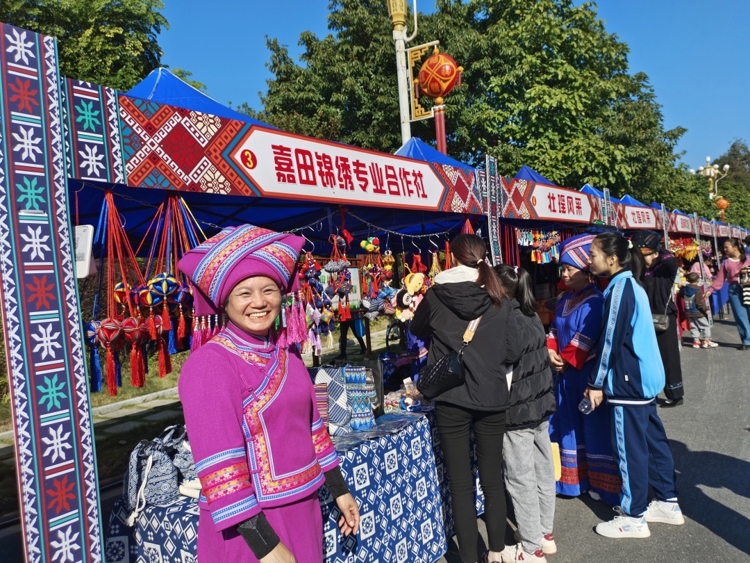 一针一线织就当地妇女“半边天”,用勤劳的双手传承民族文化、实现致富梦想、建设美丽壮乡。如今,嘉田锦绣合作社以“公司+合作社+妇女”的模式,推动刺绣、壮锦产业化、商品化,把合作社打造成文创基地、民族文化体验基地。合作社的专业绣娘团队从最初的12人,逐渐扩大到60余人,绣娘们创作的特色小挂件、手提包、摆件等产品走进景区、走出连山,实现增收50余万元。