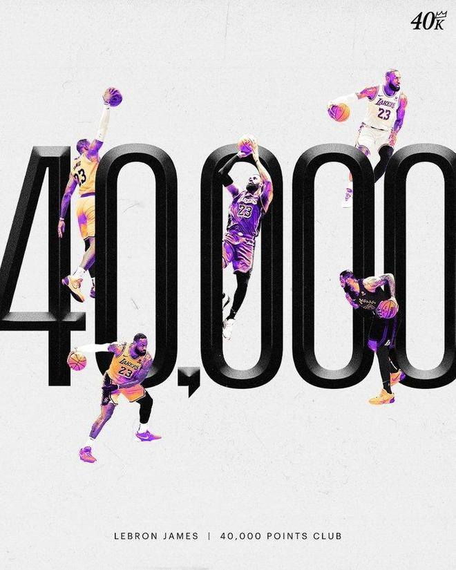 湖人官方也在社交媒体上发布海报来祝贺勒布朗:“勒布朗·詹姆斯,40000分俱乐部创始人”。