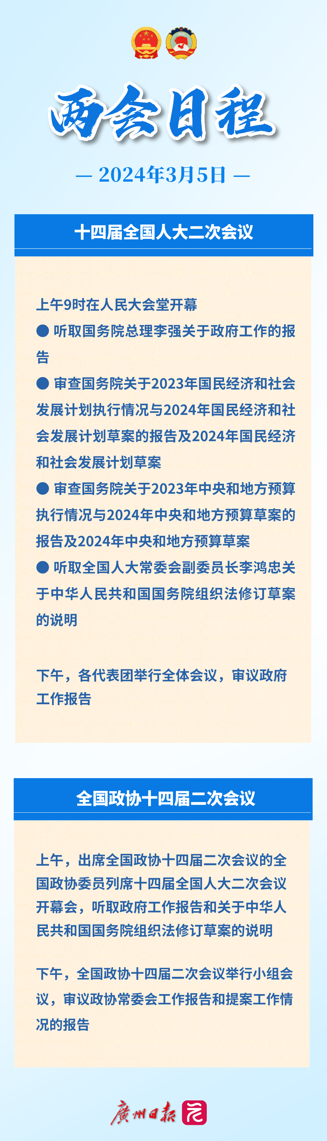 十四届全国人大二次会议5日上午9时在人民大会堂开幕,听取国务院总理李强关于政府工作的报告,审查国务院关于2023年国民经济和社会发展计划执行情况与2024年国民经济和社会发展计划草案的报告及2024年国民经济和社会发展计划草案,审查国务院关于2023年中央和地方预算执行情况与2024年中央和地方预算草案的报告及2024年中央和地方预算草案,听取全国人大常委会副委员长李鸿忠关于中华人民共和国国务院组织法修订草案的说明。下午,各代表团举行全体会议,审议政府工作报告。