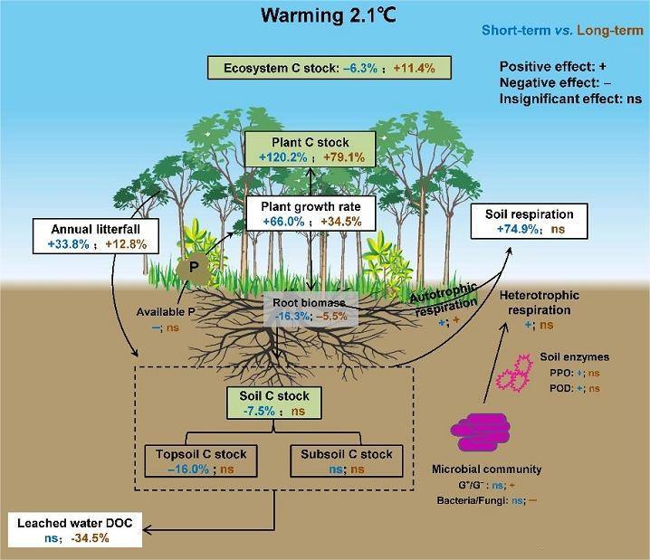 研究发现,在增温2.1℃下,南亚热带森林生态系统碳储量在短期增温下(1-2年)降低3.8%,但在长期增温下增加13.4%