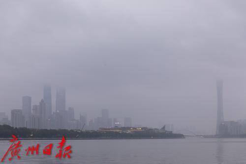 广州塔和东西塔的顶端都被雨雾笼罩着。(摄影/记者 苏俊杰 )