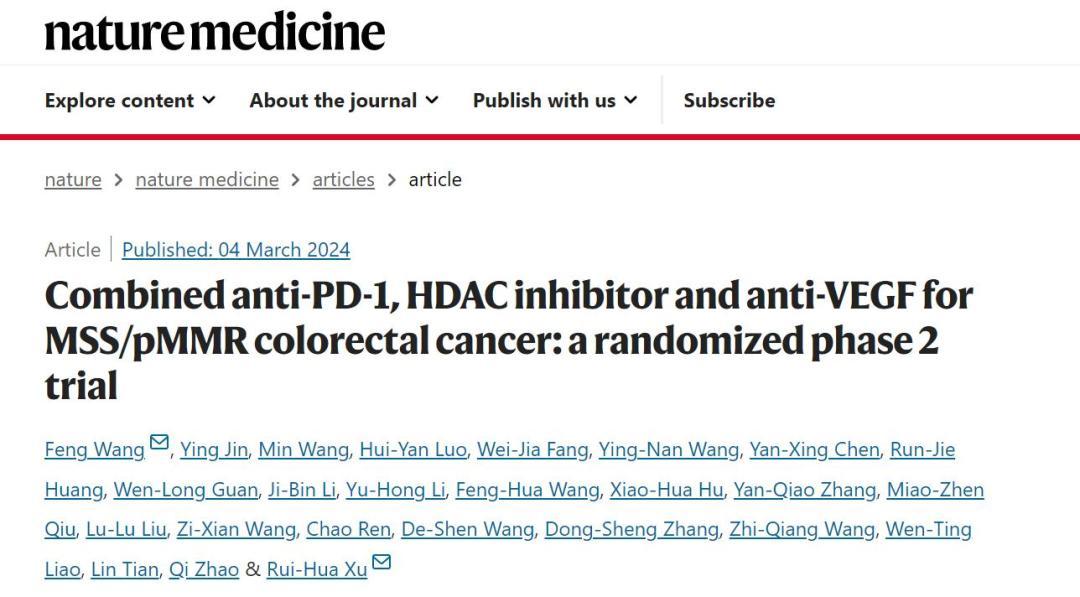 2024年3月4日,国际顶级医学期刊《自然医学》发表《抗pd-1,hdac抑制剂和抗vegf联合治疗mss/pmmr结直肠癌:一项随机二期临床研究》。中山大学肿瘤防治中心徐瑞华教授和王峰教授为该论文的通讯作者。中山大学肿瘤防治中心王峰教授、金颖副主任医师、汪敏医生、骆卉妍主任医师、浙江大学医学院附属第一医院方维佳教授为该论文的共同第一作者。