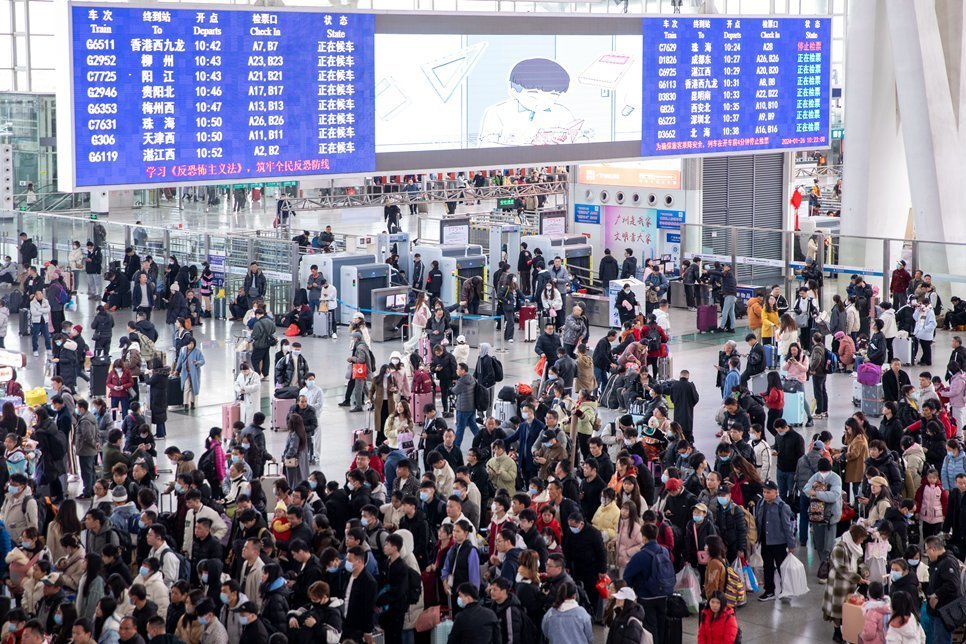 从出行人群上看,20岁至39岁人群返乡数量比2023年同期减少5.3%;60岁以上人群出行量增加近30%。数据显示,今年“反向春运”成为新趋势、新潮流,广州、深圳不仅是热门出发地,也是热门目的地,来自四川、湖北、湖南等务工省份的老年人,更多选择前往子女的工作地过年团聚。春运期间,广东各大车站累计到达4289.1万人次,其中广州南站1045.4万人次。