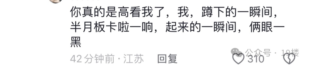 浙大二院骨科副主任医师 刘安:“在16连蹲过程中,膝关节和髋关节都是在不停屈曲伸直,膝关节从伸直到屈曲它有一个挤压的过程,在这个过程中,膝关节中间有半月板这样一个垫片,这个垫片会跟着膝关节的活动而动,如果长时间活动不当就会导致半月板被挤碎。”