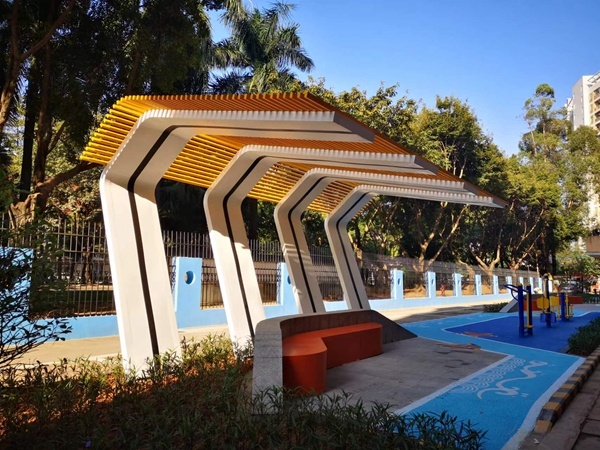 公园里设置特色座椅和休憩廊架,安装8套户外健身器材。原本杂草丛生的地块,如今成为小区住户遛娃、休闲的好去处。