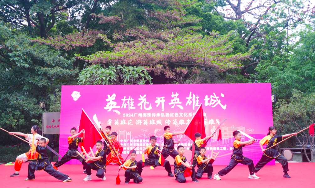 灿烂红棉燃穗府,英雄壮气振羊城。展演当天,海珠区退休干部及青少年学生代表带来了舞龙《龙腾海珠》、海珠区少年军校军事技能表演《旗语操》、红色故事宣讲《东方欲晓,莫道君行早》、合唱《祖国不会忘记》、武术《少年出英雄》等节目。整场活动以丰富多样的表现形式,生动展现了“英雄业有英雄承”的红色基因传承。