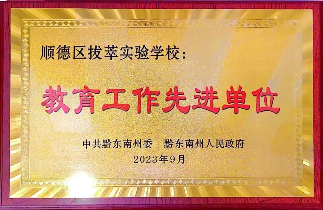 记者今日从佛山市顺德区拔萃实验学校获悉,日前,一则《中共黔东南州委 黔东南州人民政府关于表扬2023年黔东南州教育工作优秀个人和先进单位的决定》的讯息以及一副“教育先进工作单位”的金色牌匾,从贵州一角跨过大山送达了该校。这一份珍贵荣誉,见证该校几年来一直践行“教育帮扶”,“牵手”黔东南共推教育事业高质量发展。