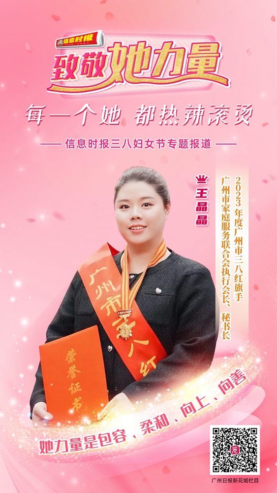 数年前,为了追求自己的理想,王晶晶放弃在国企的稳定工作,跨界转行到广州市家庭服务联合会。对于自己的工作,她分享道,“家庭服务是社会需要进一步关注和发展的领域,是朝阳行业,也是爱心工程。”王晶晶认为,在日常工作和生活中,既要着眼于帮助女性在职场8小时内绽放光芒,又要关注女性在8小时外的身、心、社、灵等多方面需求,“不仅关注女性作为女儿、妻子、母亲等角色的挑战,更关切女性作为独立自我全方位成长发展的需求。这也是我作为一名女性,为行业带来的独特视角。”