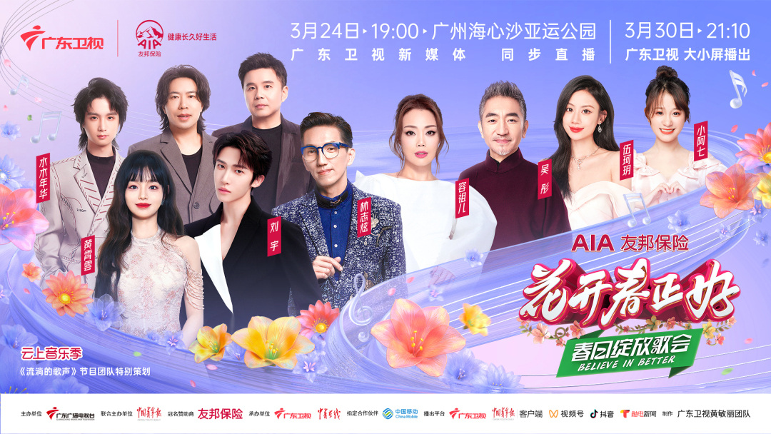 3月24日19:00,《“花开春正好”春日绽放歌会》将在广州海心沙亚运公园盛情唱响,林志炫、容祖儿、吴彤、刘宇、黄霄雲、水木年华、伍珂玥、小阿七等演艺嘉宾共赴春日之约!本场歌会由广东广播电视台、中国青年报社联合主办,广东卫视新媒体矩阵同步播出。