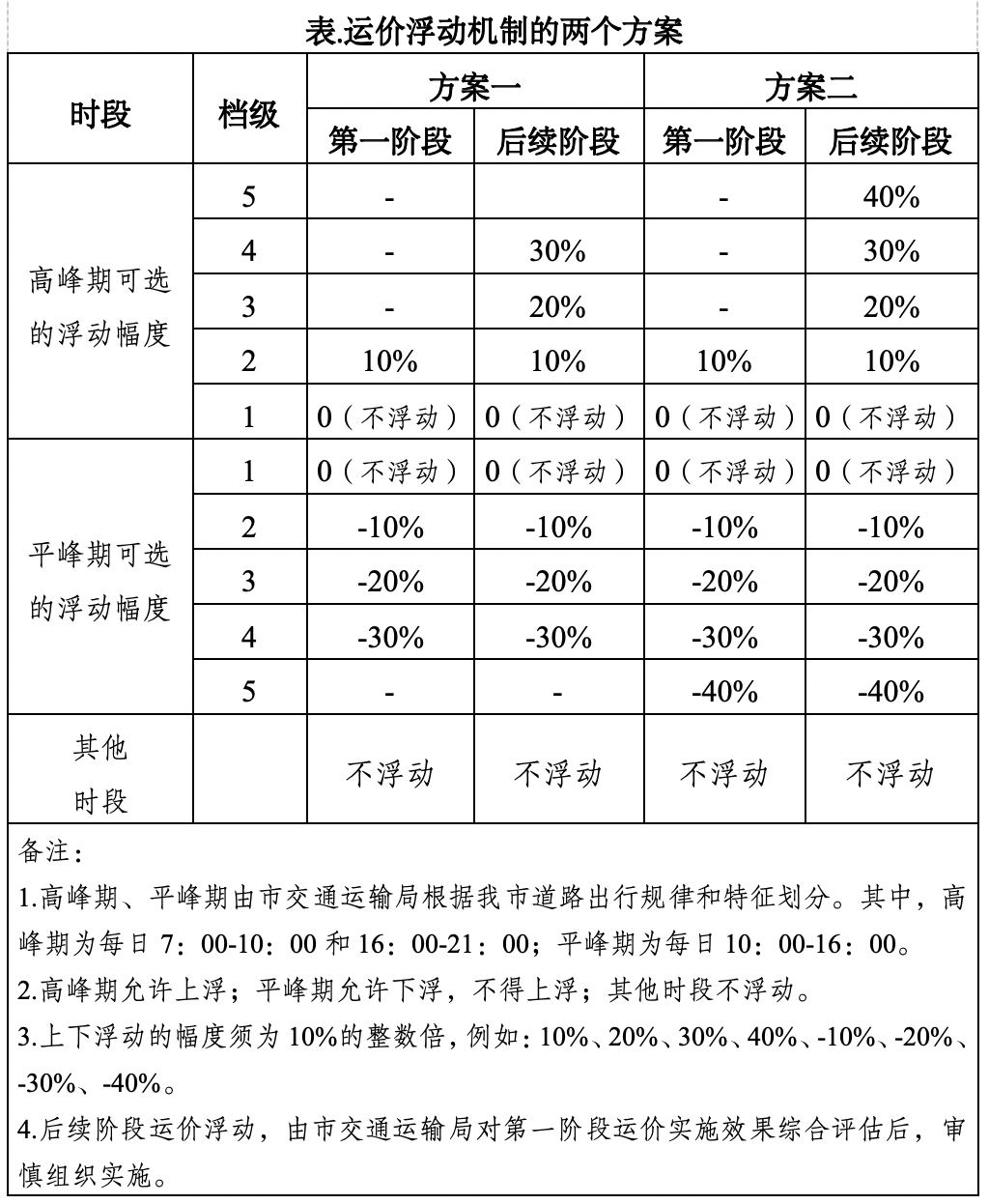 在浮动幅度方面,按高峰期、平峰期可选择运价浮动幅度的大小,提出2个具体方案,并分阶段实施,逐步扩大浮动幅度。第一阶段,高峰期浮动幅度控制在10%以内,平峰期运价下浮幅度适当扩大到30%(方案一)或40%(方案二)。后续阶段运价浮动按需启动,平峰期运价浮动幅度范围不作调整,高峰期浮动幅度再相应扩大到30%(方案一)或40%(方案二)。