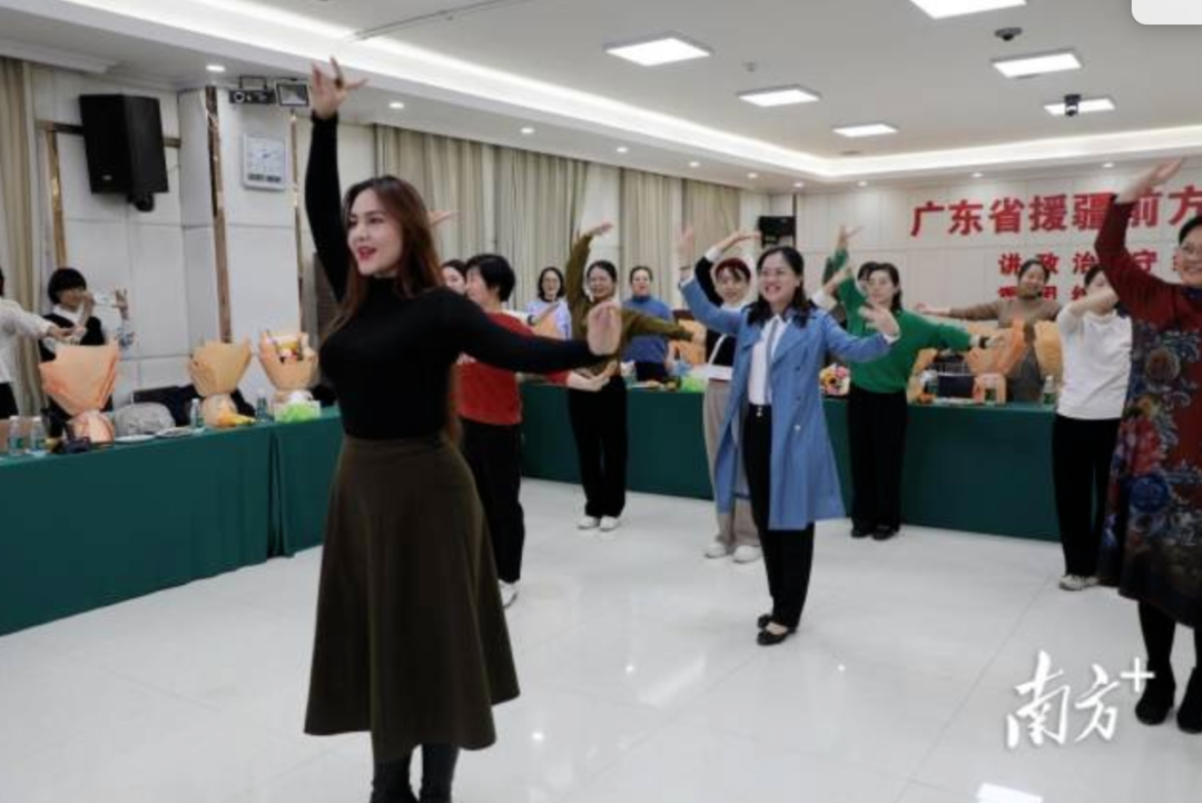 座谈会上,广东援疆指挥部还邀请了喀什地区歌舞团的舞蹈演员教援疆女同胞跳新疆舞。欢快的音乐、富有律动感的舞蹈让大家沉浸其中,既让援疆女同胞们休闲放松,同时也通过具体实在的举措加快民族间交往交流交融。此外,近期广东援疆指挥部还开展节日慰问、组织援疆风采“留影活动”,落实对广东援疆女同胞的关心。