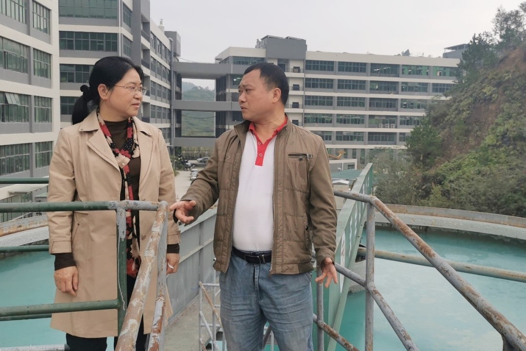 图为全国人大代表喻连香(左一)查看盛磊公司宝石加工固废、废水资源全值化利用情况。企业供图