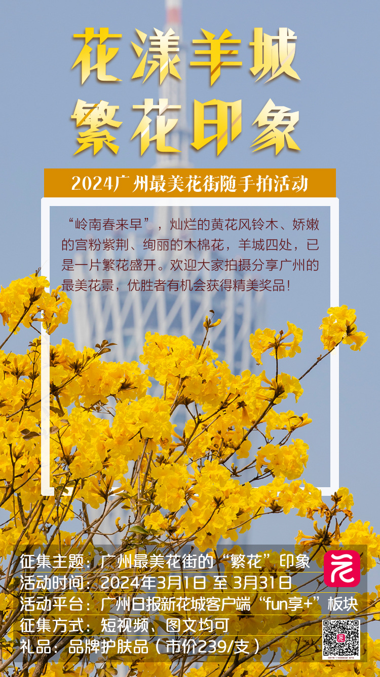 灿烂的黄花风铃木、娇嫩的宫粉紫荆、绚丽的木棉花……羊城四处,已是一片繁花盛开,生机盎然。欢迎大家拍摄分享广州大街小巷的最美花景,寻觅独属于花城的春日风光。同时,别具特色的鲜花美食、鲜为人知的广府鲜花典故、精心打理的鲜花庭院……凡是跟广州“繁花”主题相关的美景、美食、文化故事,统统欢迎大家分享出来!
