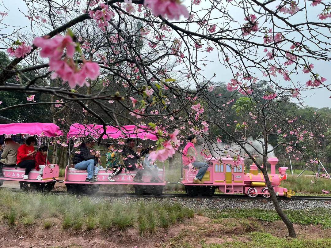 今年新开的樱花小火车备受欢迎。游客乘坐此次樱花节特别推出的“樱花小火车”穿梭花海中。除了浪漫樱花海,景区内十余里连绵翠岭,五千亩生态山林,营造出独特的赏游环境,让游客感受“一步一花海”的魅力。