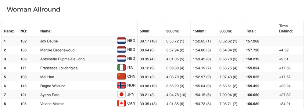 韩梅在9日的比赛中获得500米亚军、3000米第八名。10日韩梅再接再厉,在1500米比赛中获得亚军顺利晋级最后的5000米比拼,在5000米比赛中韩梅最终成绩排名第六位,综合两天四项比赛成绩,韩梅以159.025分获得女子全能第五名。荷兰选手包揽女子全能前三名。