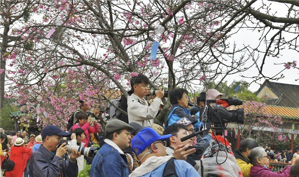 记者在宝墨园内看到,樱花节开幕式当天,宝墨园内游人如织,游客沉醉在樱花美景中,或是拍照,或是细细欣赏。汉服爱好者林小姐表示,她近几年都会和朋友一起相约到宝墨园,在樱花绽放的季节穿着汉服在有着许多古建筑的山水园林中拍照,很有感觉,拍出来的照片也非常独特。