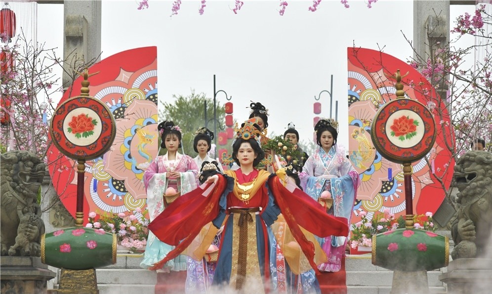 开幕式演出以还原盛唐出游赏樱情景的《樱花三月天》开场,以群仙云游路经人间福地宝墨园,举办樱花盛会为创作背景的情景剧《樱缘群仙会》《群仙献艺》将开幕式推向高潮,随后,实景沉浸式演出《情定樱花渡》更是让众多市民群众沉醉其中。实景沉浸式演出《情定樱花渡》首次在美丽的清平湖上惊艳亮相,以古建为幕,湖水为台,讲述才子佳人在樱花渡口相遇的“樱”缘故事。最后,跟随龙凤銮驾,“群仙”巡游至南粤苑,为游客呈现汉服情景剧《樱缘画遇》,画中仙女与岭南才子的“樱”缘邂逅,开启一段津津乐道浪漫佳话。